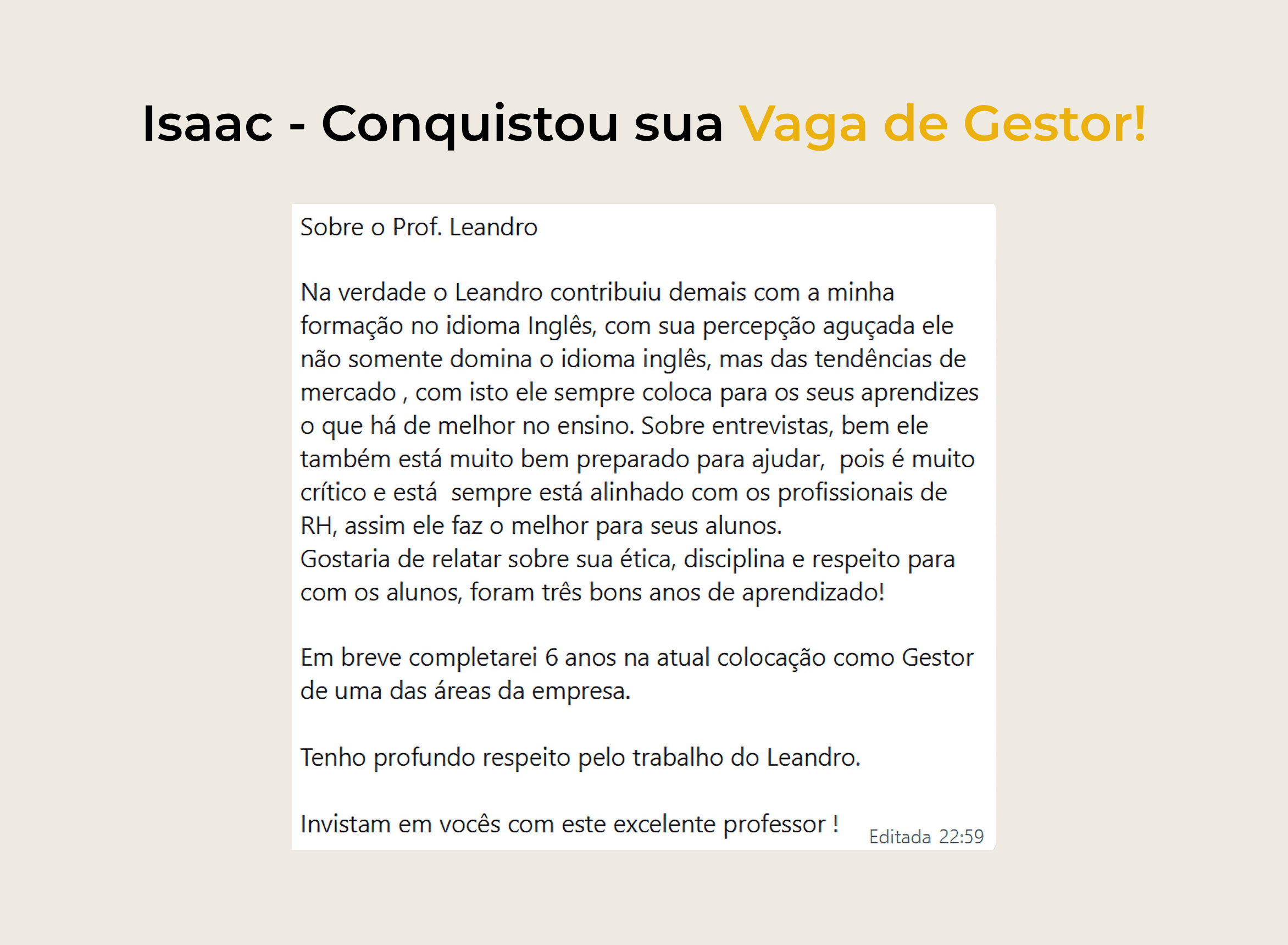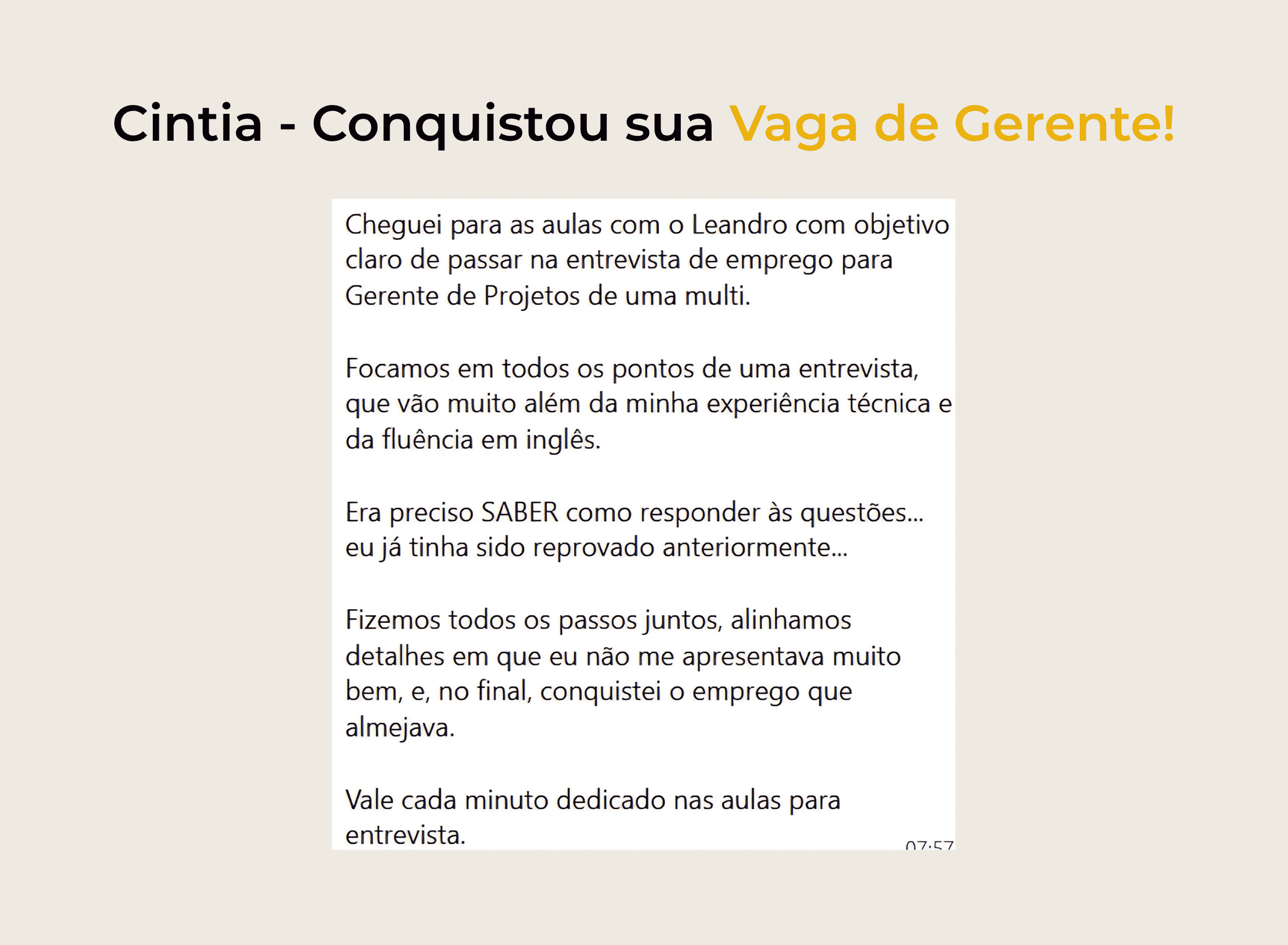Os alunos que se prepararam comigo para entrevistas foram aprovados para a vaga desejada. Alunos negociando em inglês, viajando para o Vale do Silício e fazendo networking internacional, e recepcionando estrangeiros em suas empresas com total segurança na comunicação.